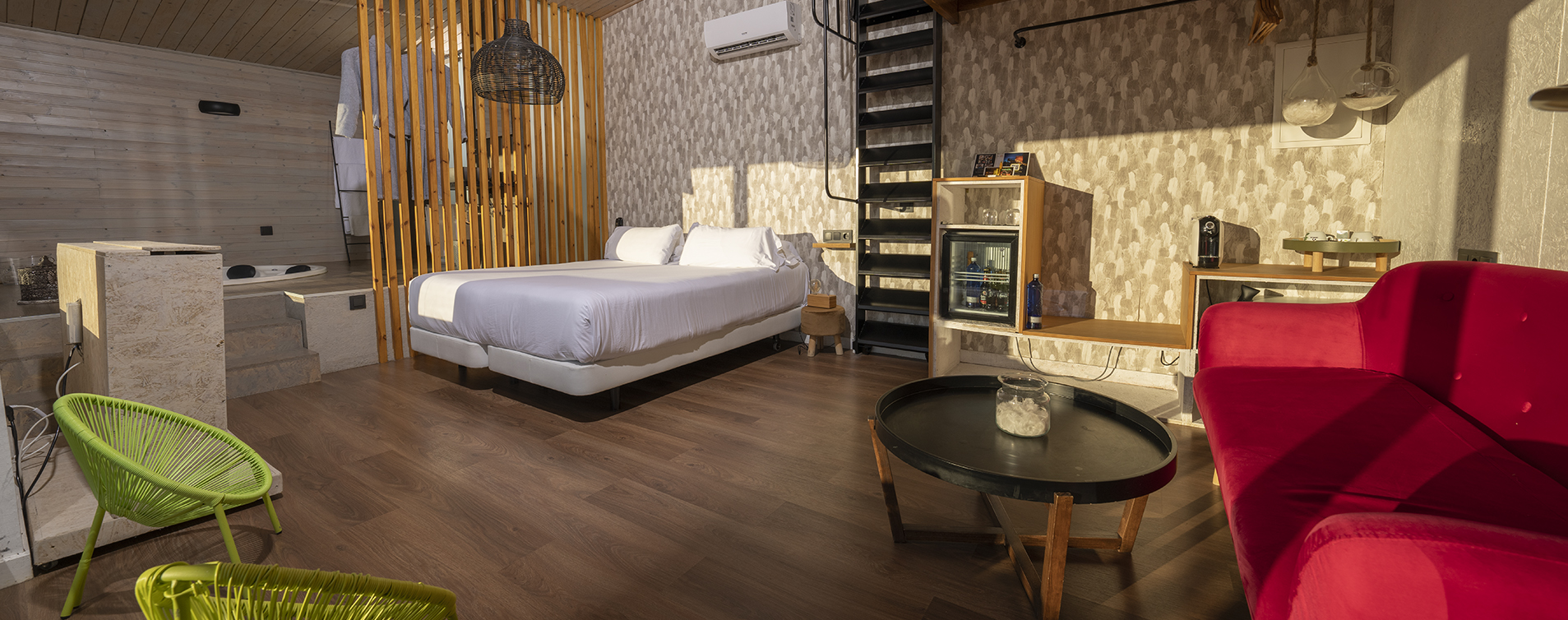 Tras el aspecto de una cabaña de diseño, inmersa en plena naturaleza, se esconde una suite de lujo con vistas a la playa de Carnota, una estancia íntima, acogedora, con tu propia terraza, tu zona de solárium, cama kingsize redonda, una gran bañera circular, chimenea, y todo el equipamiento necesario para vivir una experiencia única donde aniden vuestros sueños.